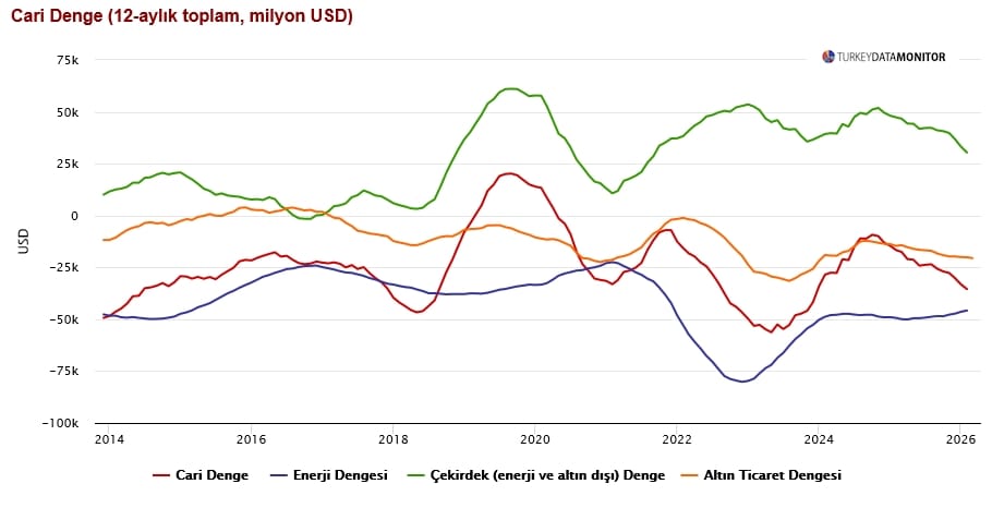 Cari denge (12 aylık): −35,4 milyar dolar (Şubat 2026, TCMB 13 Nis açıklaması). Aylık Şubat açığı: −7,50 milyar dolar. Brent'in 101,82 dolara geri dönmesi yakın vadeli cari denge rahatlama etkisini sınırlıyor; Mart verisi şokun en ağır kısmını gösterecek. CARİ DENGE